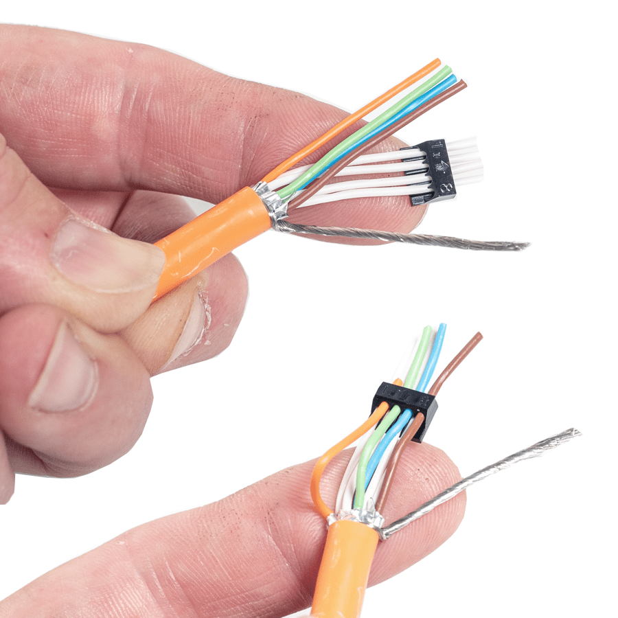 Twist de kabelafscherming en buig deze opzij. Onttwist de 4 aderparen en wrijf de aders strak recht. Leg de aders op de juiste volgorde en knip de aders recht af. Heb je de aders nettjes strak op een rijtje, dan schuif je ze gemakkelijker in de LoadBar.