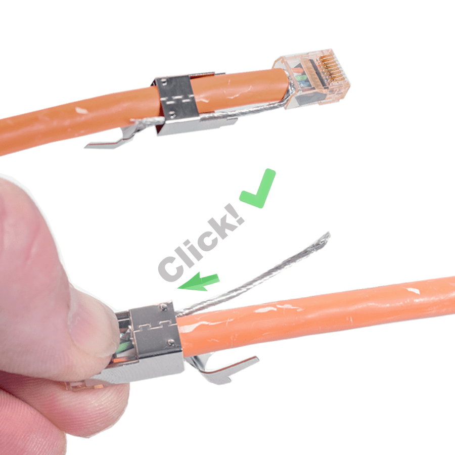 Schuif de afscherming over de connector. Druk met je duim op de connector terwijl je de afscherming aandrukt. (zie afbeelding) Als je een klein klikje hoort, zitten beide delen aan elkaar vast.