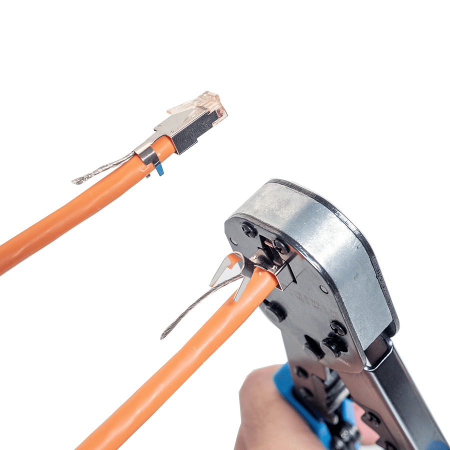 Gebruik de krimptang om de pootjes van de trekontlasting volledig om de kabel te buigen.