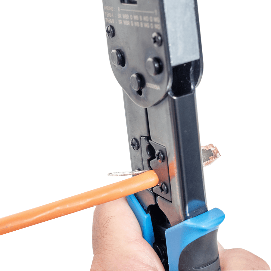 Steek de connector in de krimptang. Check of de connector volledig in de tang is gestoken. Knijp de krimptang stevig in totdat de greep weer los laat.